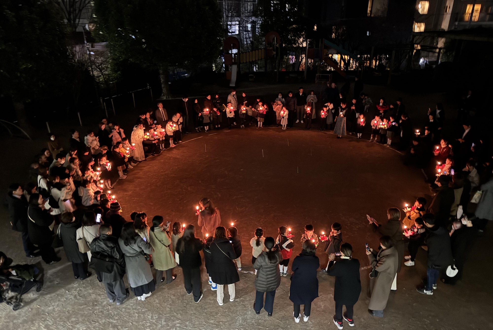 礼拝の後は園庭に集い、ろうそくの灯を手にキャロリングをしました。暗闇の中にやさしく広がる光と歌声は、まるで神さまの愛がこの場所を包み込んでいるかのようでした。