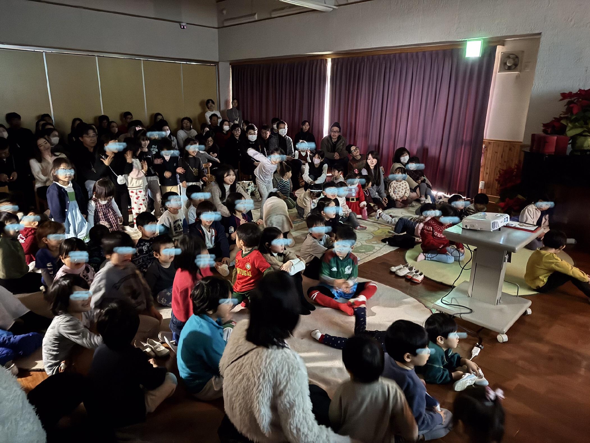 4本目のローソクに火が灯り、やわらかな光がホールいっぱいに広がりました。今日は全園児が集う、特別なクリスマス礼拝の日です。ホールにみんなで集まり、プロジェクターに映し出された絵本を見つめながら、讃美歌の歌声を合わせ、かみさまに感謝の礼拝を捧げました。